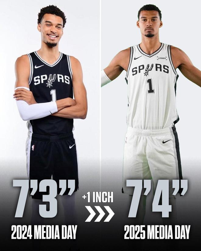 其中,马刺中锋文班亚马的身高由上赛季的7英尺3英寸(221cm)涨至7英尺5英寸(226cm),相比较上赛季,长高了5cm。