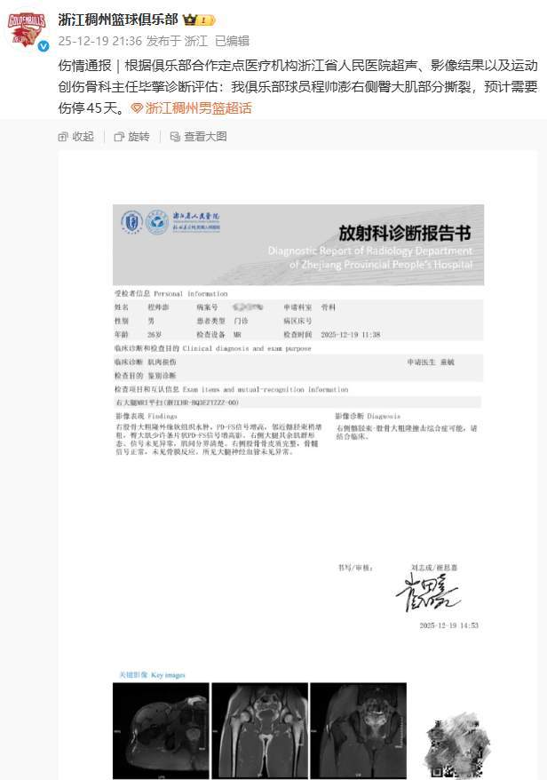 然而,机会来了,浙江男篮却又出了问题。12月19日晚上,浙江男篮自己官宣了伤病情况,球队核心后卫程帅澎“右侧臀大肌部分撕裂,预计需要伤停45天。”