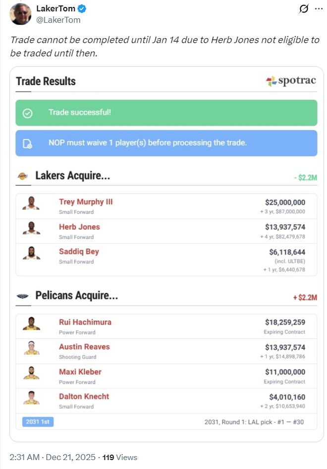他建议湖人送出里夫斯、八村垒、克内克特、克勒贝尔、2031年湖人不保护首轮去鹈鹕换特雷-墨菲、赫伯特-琼斯、萨迪克-贝,也就是换来三个锋线资产。