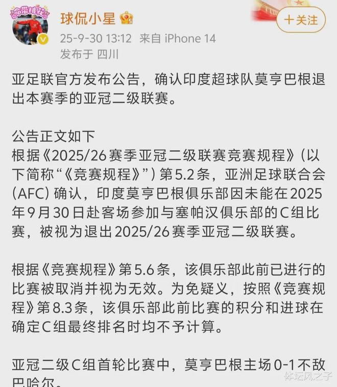 本来这样的严厉处罚是为了其他球队能够不再出现退赛的情况发生,但是就在本赛季,却又有一支亚洲豪门突然宣布了退赛,北京时间9月30日,根据亚足联官网一则公告显示:印超豪门莫亨巴根正式从本赛季亚冠赛事中退赛。这一决定背后,是俱乐部与亚足联在赛程及比赛地点调整问题上未能达成一致,最终莫亨巴根选择拒绝参赛,而亚足联也迅速做出强硬回应,宣布该队在本赛季亚冠所有轮次比赛成绩无效,直接清零。