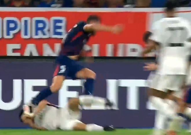 从慢镜头来看,格劳德尔右腿故意向后蹬,而且在踩到李圣龙面部之后加力下踩。令人惊讶的是,主裁判并未向格劳德尔出示黄牌或红牌,视频助理裁判也视而不见。