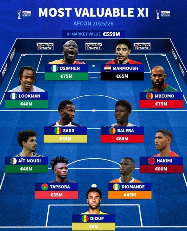 非洲杯身价最高阵容:奥斯梅恩、姆伯莫、阿什拉夫、马尔穆什在列