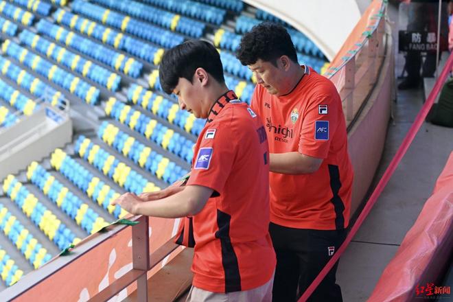 ▲江原FC的球迷全仁杓(右)正在布置看台